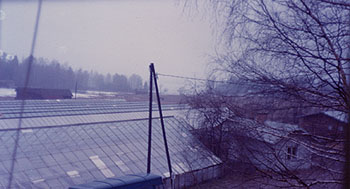 Kasvihuoneita talosta päin kuvattuna. Etuvasemmalla oleva hyötöhuone ja viereinen pikkumökki, puutarhurin asunto, purettiin myöhemmin siilon tieltä.